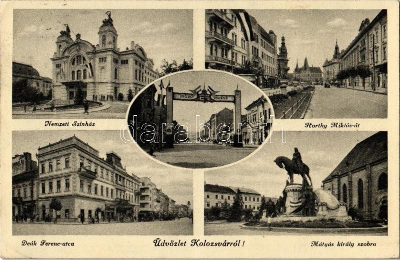 Description: 1942 Kolozsvár, Cluj; Mátyás király szobra, Nemzeti színház, Deák Ferenc utca, Horthy Miklós út, "Erdély visszatér" díszkapu / statue of Matthias Corvinus, theatre, streets, irredenta decorated gate