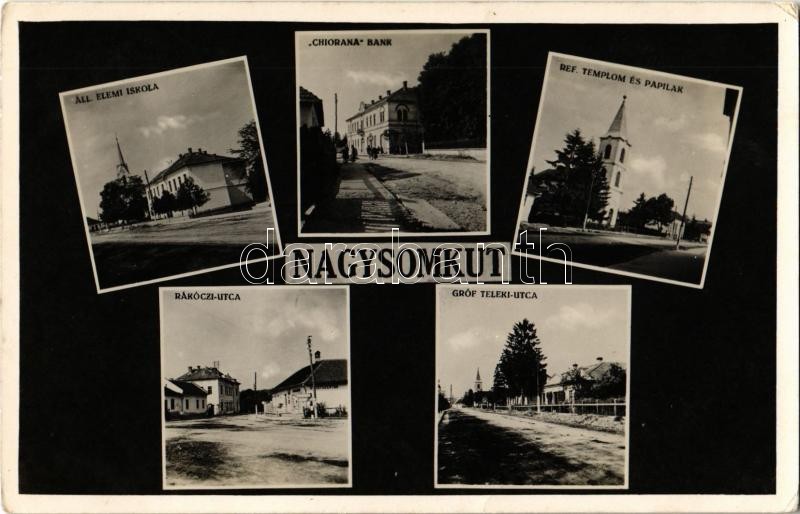 Description: Nagysomkút, Somcuta Mare; Állami elemi iskola, Református templom és paplak, Rákóczi utca, Gróf Teleki utca, Chiorana Bank / school, streets, Calvinist church and rectory, bank