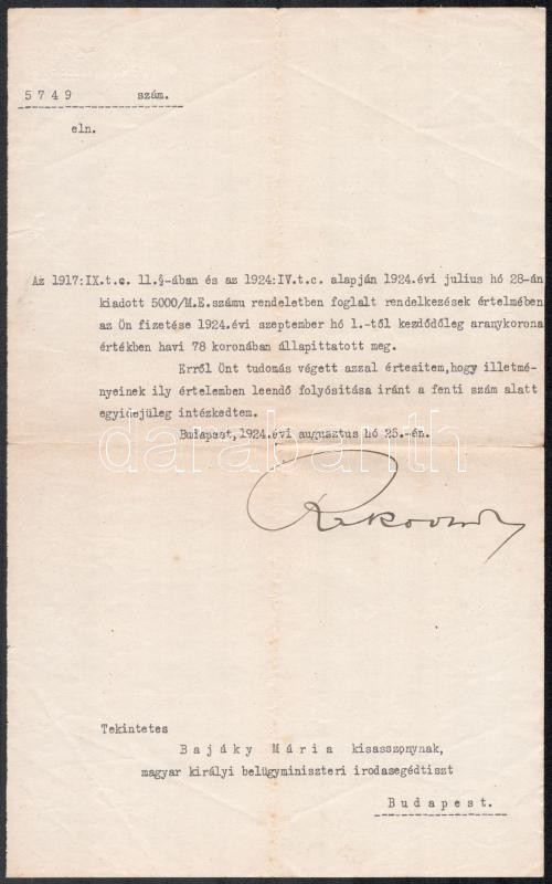 1924 Rakovszky Iván (1885-1960) a Bethlen-kormány belügyminiszterének (1922-1926) saját kezű aláírása egy fizetésemelési papíron, 1924. aug. 25.