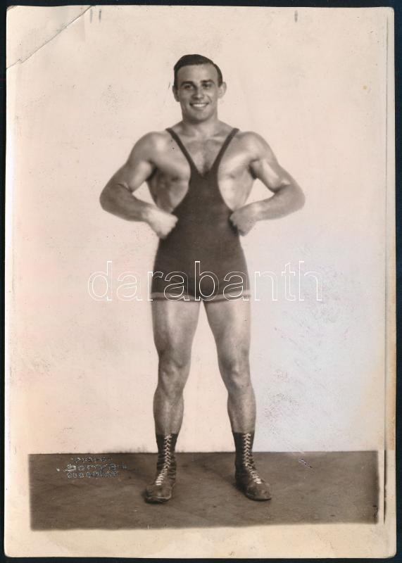 Description: 1930 Papp László (1905-1989) Európa-bajnok és olimpiai ezüstérmes birkózó, mesteredző, szakíró, sportvezető dedikált fotója, az egyik sarkán törésnyommal, 15x11 cm