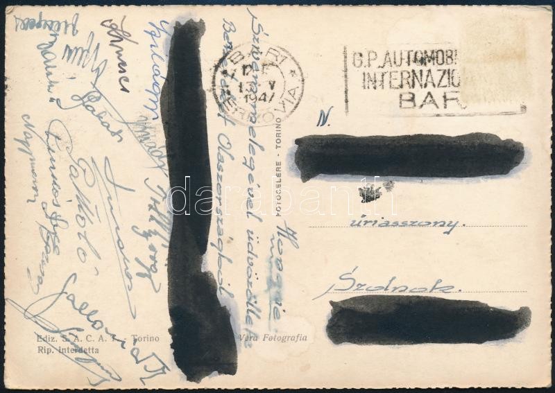 1947 A magyar labdarúgó-válogatott Olaszország-Magyarország (3:2) mérkőzés alkalmából aláírt képeslapja. Puskás, Nagymarosi, Tóth, Szűcs, Balogh II, Kirádi, Susza, Zsengellér, stb / Autograph signed postacard of the Hungarian football team from an Italy-Hungary match.