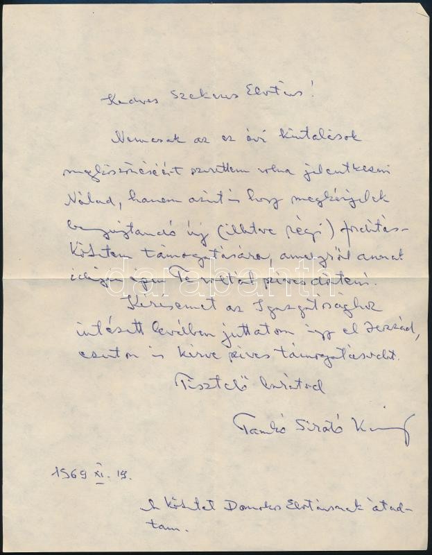 Description: 1969 Tamkó Sirató Károly (1905-1980) József Attila-díjas költő, műfordító saját kézzel írt levele Szekeres György (1914-1973) újságíró, műfordító, az Európa Kiadó főszerkesztője részére, 1969. XI. 19., Tamkó Sirató Károly saját kezű aláírásával.