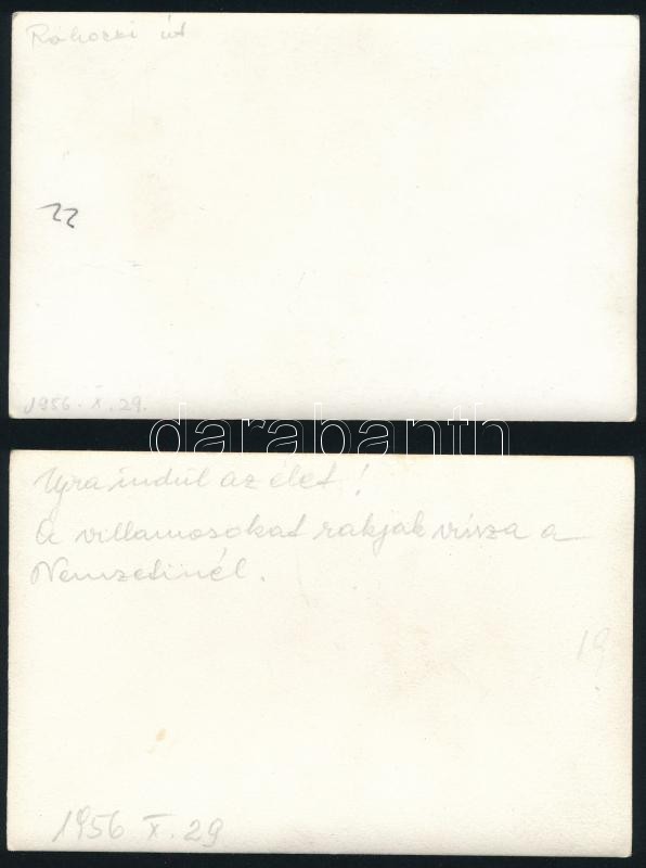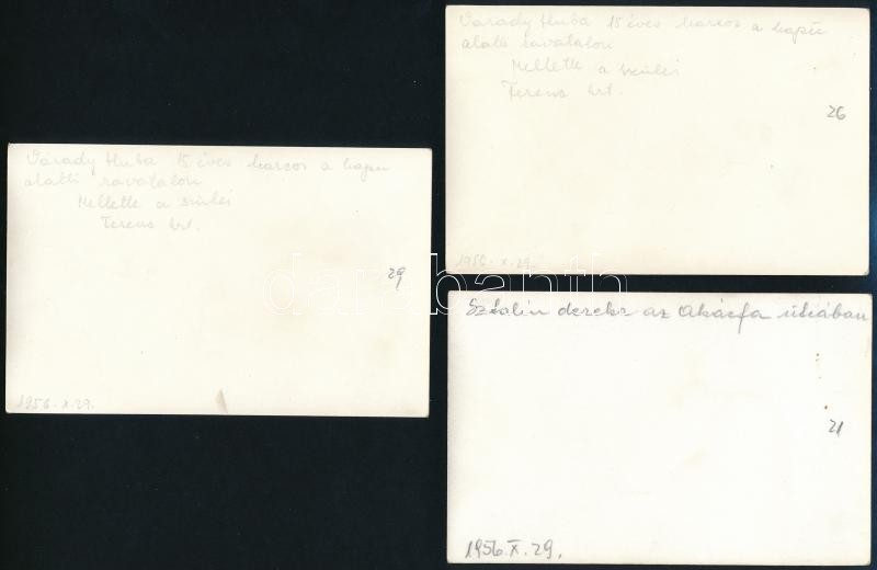 1956 Gond és hitvallás. A magyar írók nyilatkozata. 1956. dec. 2., hajtott, 2 sztl. lev. A Magyar Írók Szövetsége nyilatkozata, az 1956-os forradalom egyik leghíresebb dokumentuma, amely hitet tesz a forradalom követelései mellett. Később szerepet játszott abban, hogy a szövetséget feloszlatták. + 1956 Az 1956-os forradalomról szóló, budapesti eseményeket ábrázoló fotóanyag, összesen 30 db, 2 kivételével számozott fotó, feliratozva, dátumozva. Két fotón Várady Huba diák forradalmár ravatalával, Dienes István (1929-1995) régész, muzeológus hagyatékából, 14x9 cm és 10x8 cm közötti méretben.
