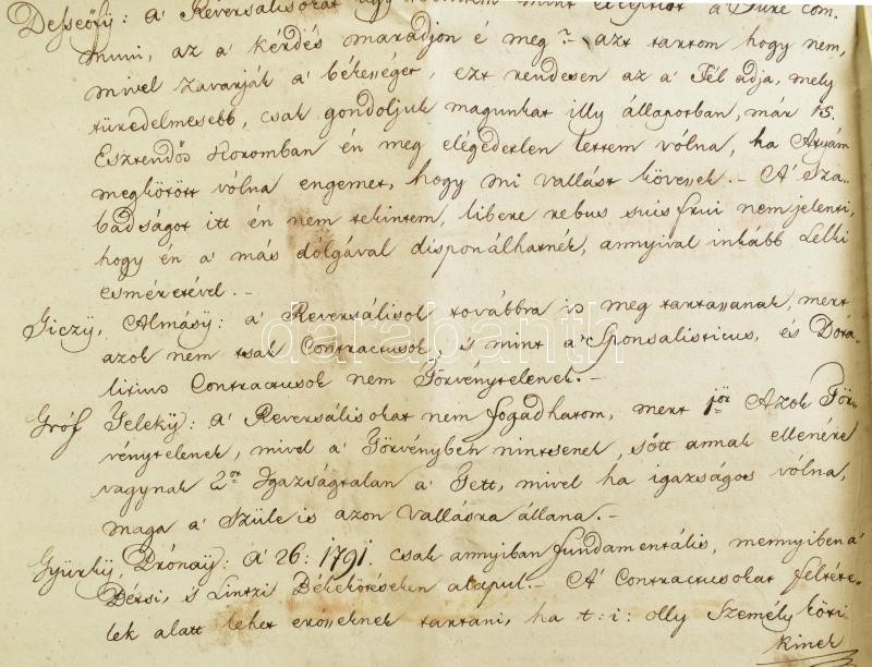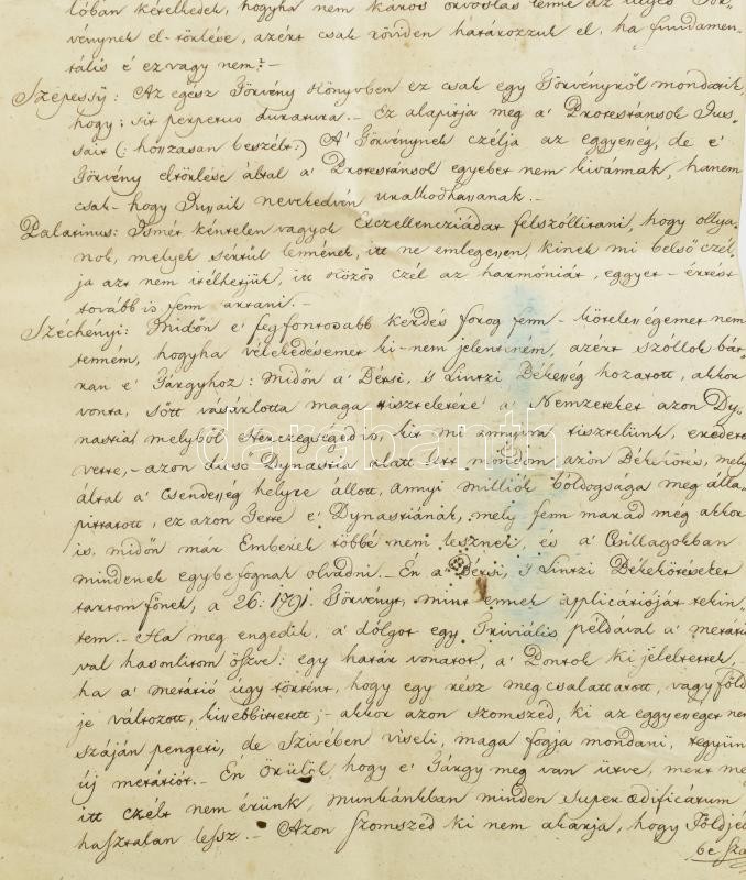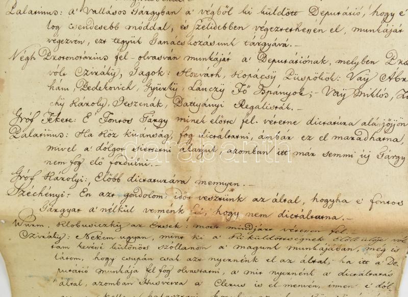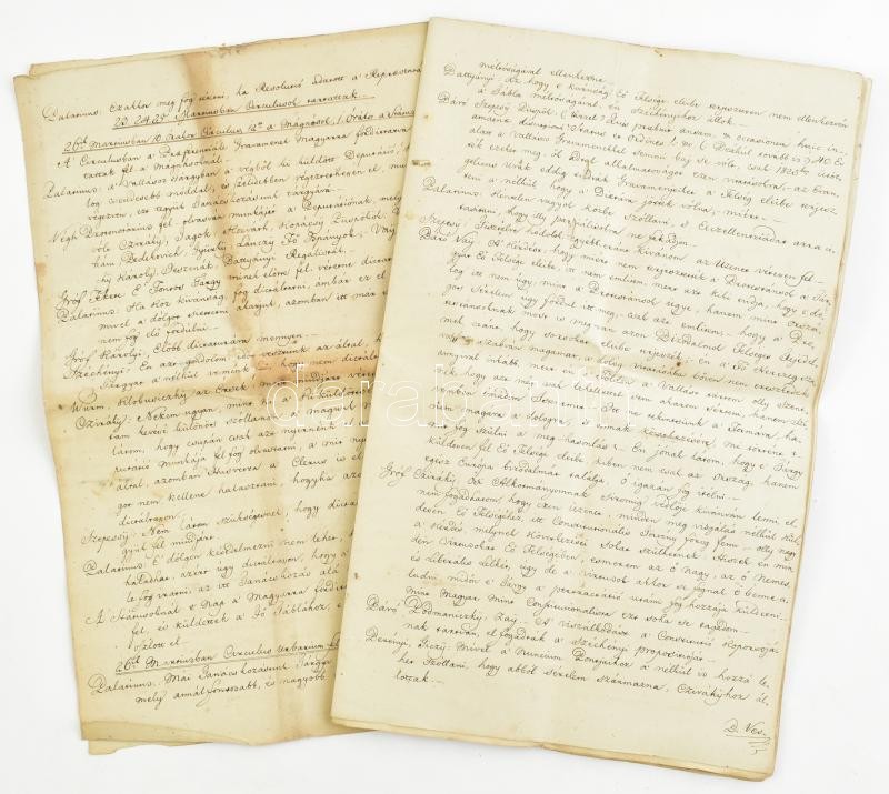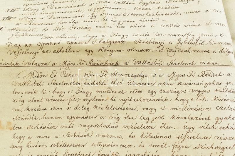 cca 1833 Országgyűlési jegyzőkönyv részlete, benne a Főrendiház vallási ügyekről szóló vitával, benne a kor neves politikusaival, főrendjeivel (Batthány, Dessewffy Aurél, Széchényi, Wesselényi...stb.), magyar nyelven, ismeretlen személy tollából, két lapon sérüléssel, lyukkal, 12 sztl. lev.