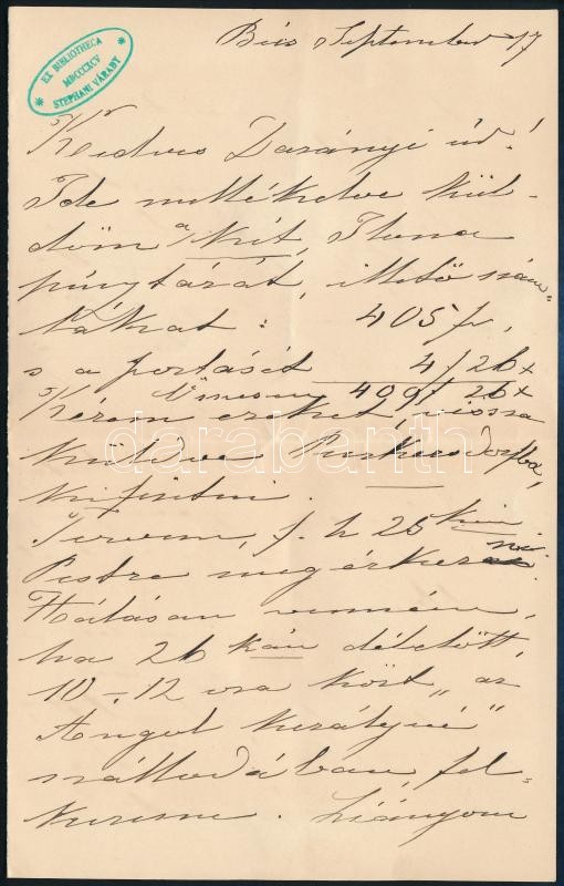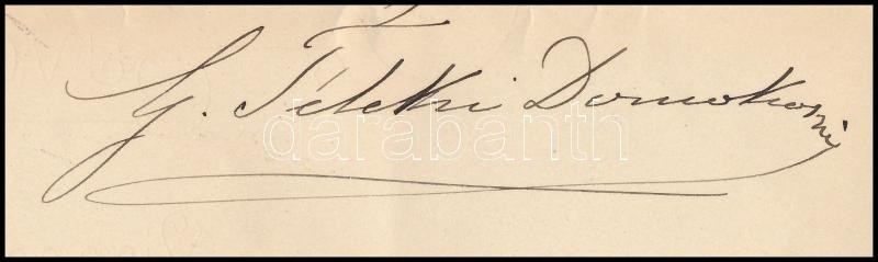 cca 1870-1890 Gr. Teleki Domokos saját kézzel Ãrt levele Darányi Gyula (1867-1937) részére, "Kedves Darányi úr!" megszólÃtással, a levélben meghÃvással az 'Angol KirálynÅ‘' szállodába, és a Pestre érkezÅ‘ Darányi Ignác (1849-1927) hÃrével, valamint egyéb ügyekkel, Teleki Domokos saját kezű aláÃrásával, 'Ex Bibliotheca MDCCCXV Stephani Várady' bélyegzéssel, 2,5 beÃrt oldal.