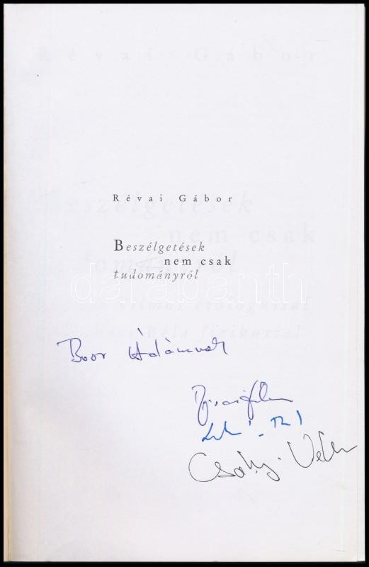 Révai Gábor: Beszélgetések nem csak tudományról. Csányi Vilmos etológussal és Lukács Béla fizikussal. Bp., 2008, Corvina. Kiadói papírkötés. A szerző, Révai Gábor (1947-2020) író, műfordító, Lukács Béla (1947-) fizikus, és Csányi Vilmos (1935-) Széchenyi-díjas magyar biológus, biokémikus, etológus általi HÁRMAS dedikációval.