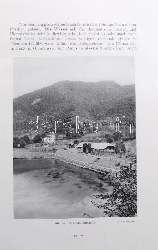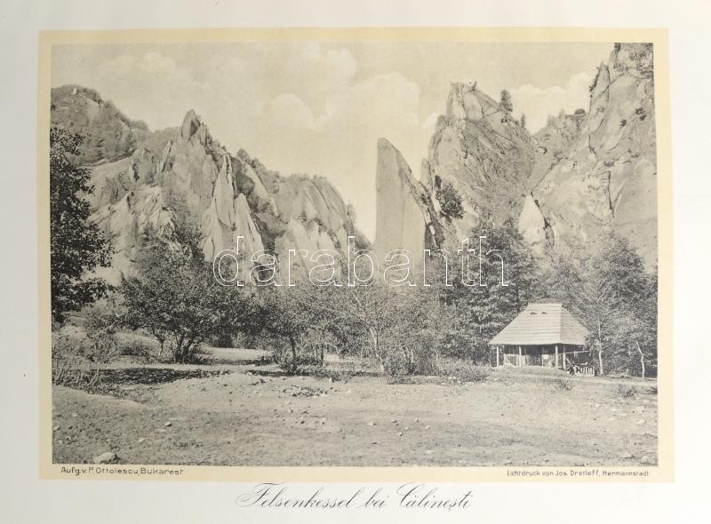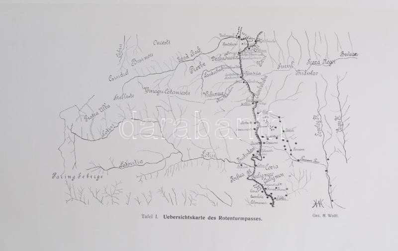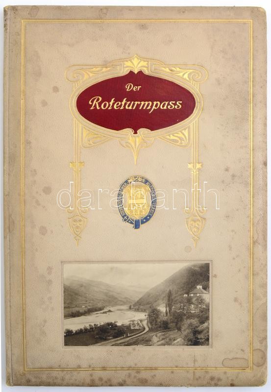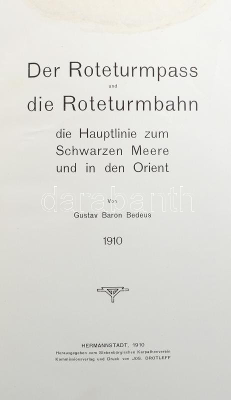 Gustav Bedeus: Der Roteturmpass und die Roteturmbahn die Hauptlinie zum Schwarzen Meere und in den Orient. (A Vöröstoronyi-hágó és a Vöröstoronyi vasút fővonalai a Fekete-tengerig és kelet felé.) Hermannstadt (Nagyszeben), 1910, Siebenbürgischen Karpathenverein (Erdélyi Kárpát Egyesület), (Jos. Drotleff-ny.), 73 p.+ 4 (egészoldalas képtáblák) t. + 2 (1 kihajtható térkép, 1 kihajtható tábla, rajta térképpel és vasútvonal táblázattal) t. Német nyelven. Szövegközti fekete-fehér fotókkal és egy egészoldalas fekete-fehér fotóval, valamint 4 egészoldalas képtáblával gazdagon illusztrálva. Kiadói aranyozott, festett egészbőr-kötés, az elülső kötéstáblán az Erdélyi Kárpát Egyesület aranyozott-festett címerével, és fekete-fehér fotóval, foltos, kissé kopott borítóval, restaurált címlappal, ex libris-szel, 'Franz Neuzil Papierwarenfabrik, Hermannstadt' címkével a hátsó szennylap belsején. Ritka, gyűjtői darab! / Gustav Bedeus: Der Roteturmpass und die Roteturmbahn die Hauptlinie zum Schwarzen Meere und in den Orient. Hermannstadt (Sibiu), 1910, Siebenbürgischen Karpathenverein (Transylvanian Carpathian-Association), (Jos. Drotleff), 73 p.+ 4 (full-page illustrations) t. + 2 (1 pc. openable map, 1 pc. railway line table with map) t. In German language. With a lot of black-and-white photographs. Gilt and coloured full leather-binding, with the coat of arms of the Transylvanian Carpathian-Association and a black-and-white photographs on the first cover, with spotty cover, and the title page restored, with ex libris, and label of ''Franz Neuzil Papierwarenfabrik, Hermannstadt'. Rare!