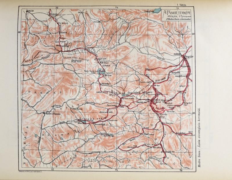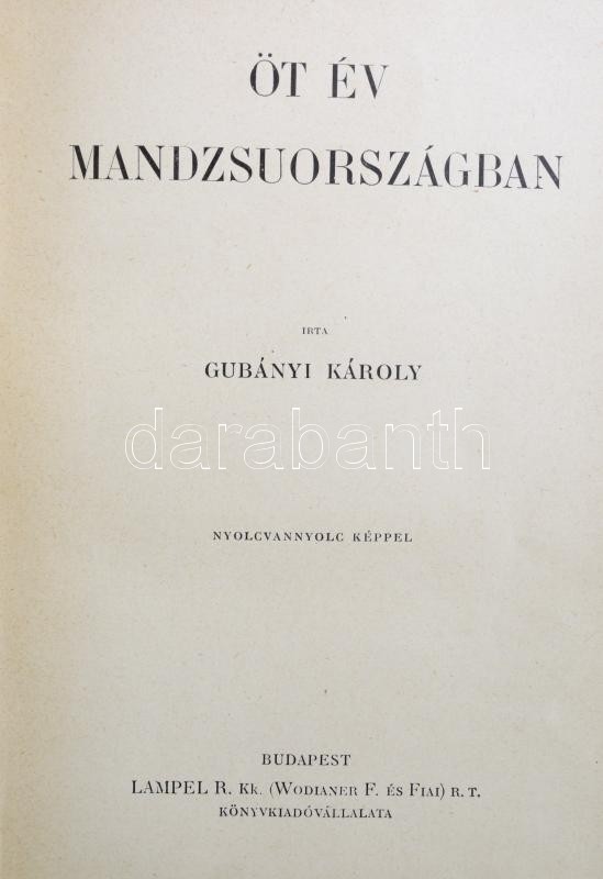 Magyar Földrajzi Társaság Könyvtárának 4 kötete, közte két kötetes, összesen 6 könyv: Gubányi Károly (1867-1935): Öt év Mandzsuországban. Lóczy Lajos előszavával. Bp.,[1906], Lampel R. (Wodianer F. és Fiai) Rt., VII+327+1 p.+15 t.(Egészoldalas fekete-fehér fotók)+1 térkép. Szövegközti fekete-fehér fotókkal illusztrált. [Hedin, Sven (1865-1952)] Sven Hedin: Ázsia szívében I-II. kötet. Tízezer kilométernyi úttalan utazás. Fordította: Dr. Thirring Gusztáv. Képekkel és térképekkel. Bp., [1906], Lampel R. (Wodianer F. és Fiai) Rt., 1 t. (címkép)+8+214+2 p.+16 t.+ 1 térkép.; 4+270+2 p. +16 t. Gazdag egészoldalas és szövegközti fekete-fehér fotókkal és egy térképpel illusztrálva. A 2. kötet hátsó szennylapján és a kötéstábla belsejének papírborításán kis hiánnyal.; [Hedin, Sven (1865-1952)] Sven Hedin: Ázsia sivatagjain keresztül. Átdolgozta: Dr. Thirring Gusztáv. Bp., [1902], Lampel R. (Wodianer F. és Fiai) Rt., 1 (címkép) t. + 221+2 p. + 16 (fekete-fehér fotók) t. + 2 ( közte 1 kihajtható térképpel) t. Gazdag fekete-fehér egészoldalas és szövegközti képanyaggal illusztrált.; [Lugi Amadeo di Savoia-Aosta, duca degli Abruzzi (1873-1933)] Szavójai Lajos Amádé. Az "Észak csillaga".(,,Stella Polare.") Az Északi sarkitengeren 1899-1900. I-II. kötet. Fordította: Dr. Darvai Móric. Bp.,[1904], Lampel R. (Wodianer F. és Fiai.) Rt., 218 p. + 19 (fekete-fehér fotók) t.; 199 p. + 7 (fekete-fehér fotók) t. + 2 (egy kétoldalas, egy kihajtható térkép.) t. Gazdag fekete-fehér képanyaggal illusztrált. Kiadói dúsan aranyozott, festett egészvászon-kötésekben, Svend Hedin: Ázsiai szívében c. könyv II. kötetében a hátsó szennylapon és a hátsó kötéstábla belsejének papírborításán kis hiánnyal, ettől és egy-két kisebb kopásnyomtól eltekintve szép állapotban.