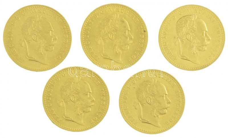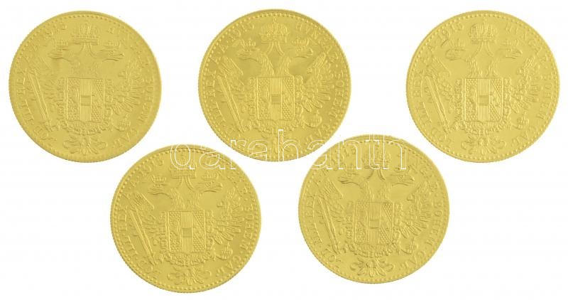 Description: Ausztria 1915. 1D Au "Ferenc József" utánveret (5x) (~3,54g/0.986/db) T:1-,1- (PP) apró ph. / Austria 1915. 1 Ducat Au "Franz Joseph I" restrike (5x) (~3,54g/0.986/pc) C:AU, AU (PP) small edge error Krause KM# 2267