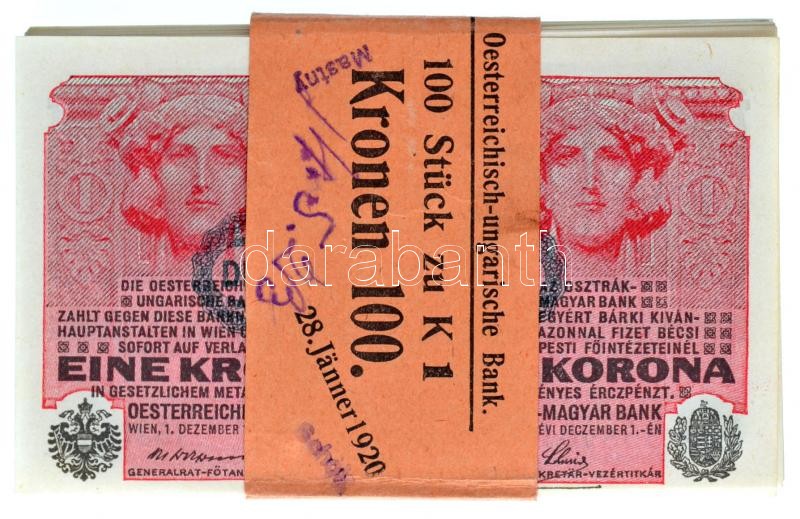 1916. 1K (96x) zöld "DEUTSCHÖSTERREICH" felülbélyegzéssel, sorszámkövetők "358901-358999", három hiányzó darab: "358924, 358976, 358995", eredeti "Osztrák-magyar bank" kötegelőben T:I,I- / Hungary 1916. 1 Krone (96x) with green "DEUTSCHÖSTERREICH" overprint, sequential serials "358901-358999", three pieces missing: "358924, 358976, 358995", with original "Österreichisch-ungarsche Bank" wrapper C:UNC,AU Adamo K3B