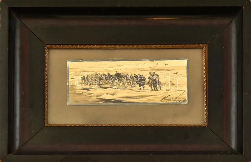Krupka Ferenc (1870-1928): Sebesült katonák menete az I. világháborúban. Tus, papír, kartonra kasírozva. Jelzett. Hátoldalán sérült címkén feliratozott. Üvegezett antik keretben, 7×18 cm / Ferenc Krupka (1870-1928): Wounded maching soldiers during World War I. Ink on paper, mounted on cardboard. Signed. With description on the reverse. In antique frame with glass, 7×18 cm