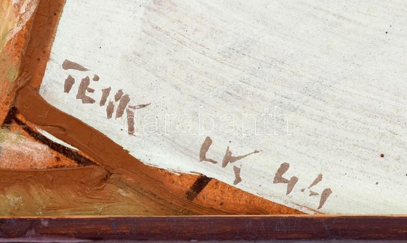 Tenk László (1943- ): Ananász és banán. Olaj, tempera, farost, jelzett, hátoldalán autográf felirattal. Fa keretben, 36×60 cm / László Tenk (1943- ): Ananas and banana. Oil, tempera, wood fibre, signed, with autograph description on the reverse. In wooden frame, 36×60 cm