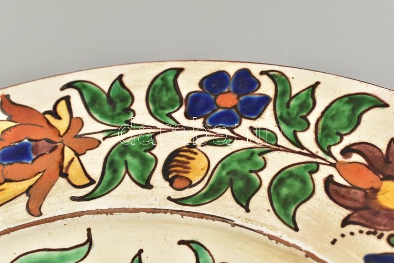 Badár Balázs (1855-1938): Fali tál, mázas kerámia, kézzel festett, mázhibákkal, kopásnyomokkal, jelzett, m: 40 cm