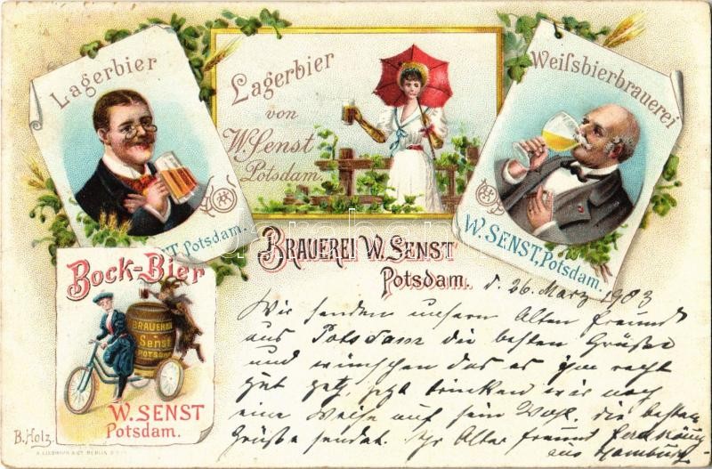 1903 Brauerei W. Senst, Potsdam. Lagerbier, Bock-Bier, Weissbierbrauerei / German beer advertisement, brewery. Art Nouveau, floral, litho s: B. Holz