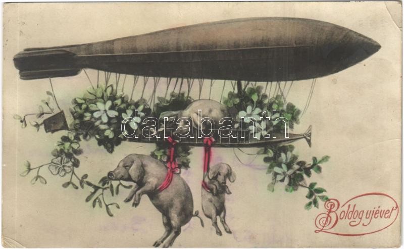 Boldog újévet! Léghajó malacokkal / New Year greeting, airship with pi...