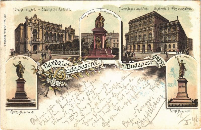 1896 (Vorläufer) Budapest, Fővárosi vigadó, Deák, Petőfi és Eötvös szobor, Tudományos akadémia. Ottmar Zieher Art Nouveau, floral, litho (Rb)