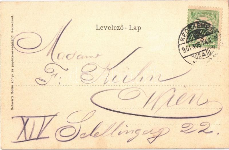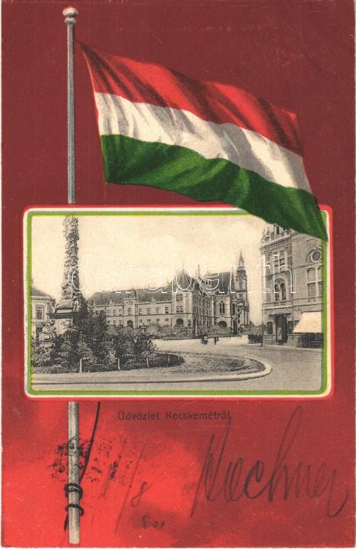1901 Kecskemét, Szentháromság szobor. Schwartz Soma kiadása, Szecessziós magyar zászló, Art Nouveau, litho