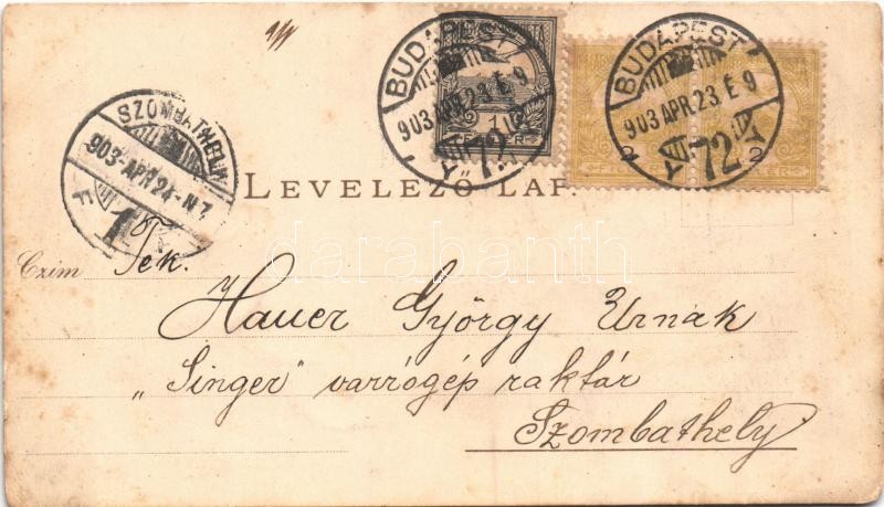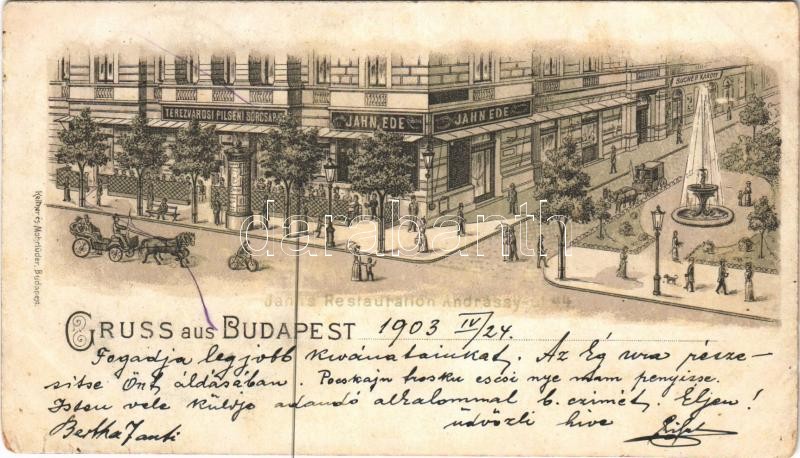Description: 1903 Budapest VI. Jahn Ede vendéglője, étterem, Terézvárosi Pilseni Sörcsarnok, Bucher Károly üzlete. Andrássy út 44. Kiadja Kellner és Mohrlüder. litho