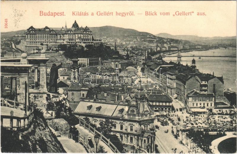 1909 Budapest I. Kilátás a Gellért-hegyről, Gellért szobor, Tabán, Döbrentei tér, vár, Rácz fürdő, piac, fodrász, Stosz-féle vendéglő, Keller Ignác üzlete. Taussig A. 10648. (fl)