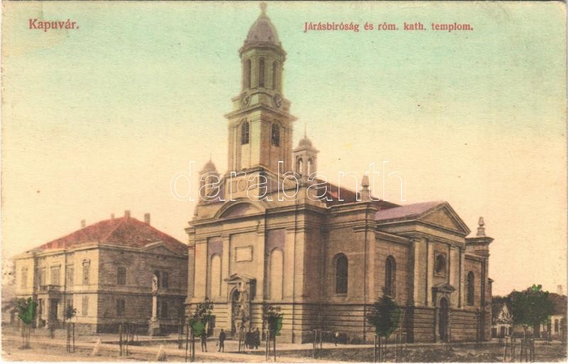 1915 Kapuvár, Járásbíróság és római katolikus templom. Schemmel Károly kiadása