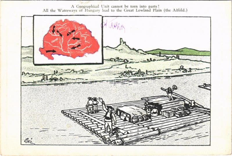 Description: Földrajzi egységet nem lehet szétszakítani! Magyarország összes vízi utai a magyar Alföld felé vezetnek. Kiadja a Pátria rt. / Hungarian irredenta art, Trianon s: Bér