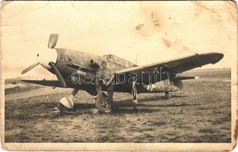 Második világháborús osztrák-magyar katonai repülőgép katonával / WWII Hungarian T-W military aircraft with soldier. photo (gyűrődések / creases)