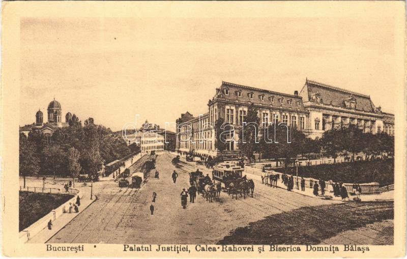 1916 Bucuresti, Bucharest, Bukarest; Palatul Justitiei, Calea Rahovei si Biserica Domnita Balasa / palace of justice, street, horse-drawn tram, church