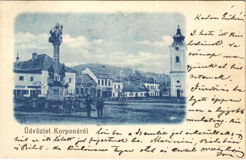 1899 (Vorläufer) Korpona, Krupina; Szentháromság szobor és tér, templom, üzlet / Trinity statue and square, church, shop