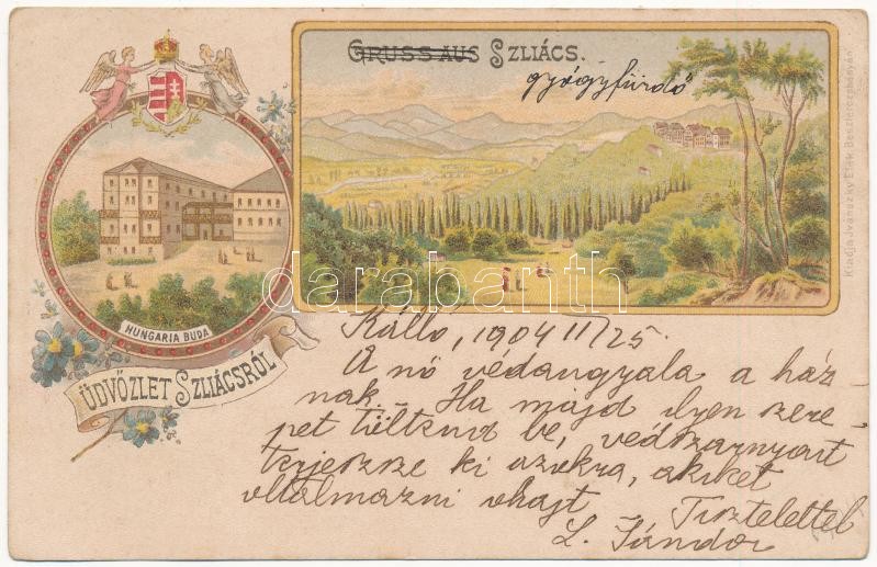 1904 Szliács, Sliac; Hungaria Buda szállók. Ivánszky Elek kiadása, szecessziós magyar címer / hotel. Art Nouveau, floral, litho (EK)