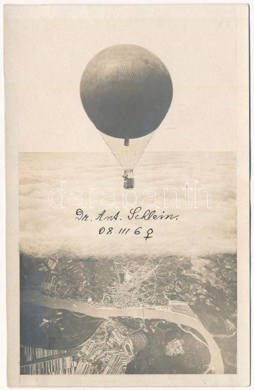 1908 Pozsony, Pressburg, Bratislava; léghajó a város felett. légi felvétel / airship above the city. aerial view, Dr. Anton Schlein photo