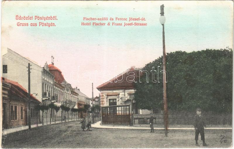 Pöstyén, Piestany; Fischer szálló, Ferenc József út. Gipsz H. 262. / hotel and street