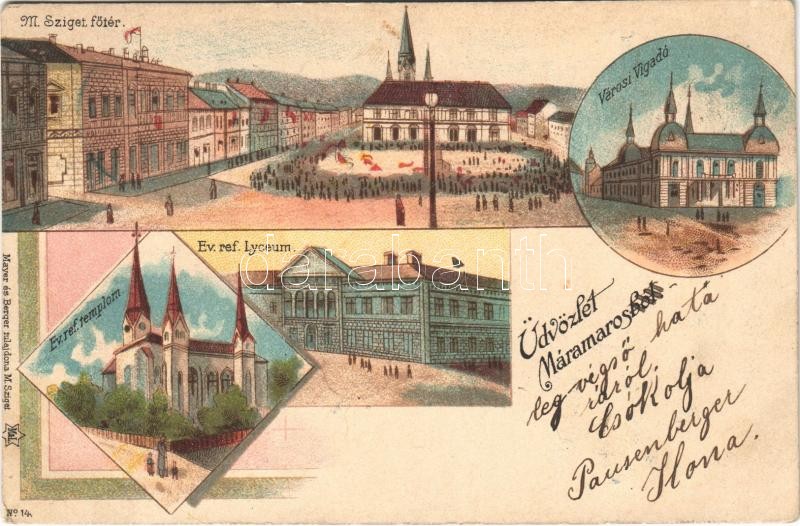 Description: 1900 Máramarossziget, Sighetu Marmatiei; Főtér, Városi vigadó, Református templom és lyceum. Mayer és Berger kiadása / main square, redoute, church and school. Art Nouveau, litho