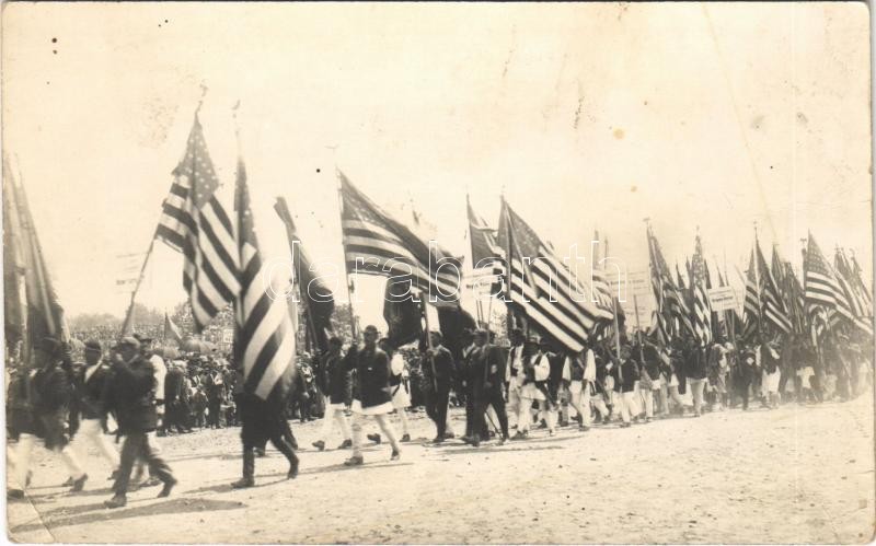 Description: 1918-1928 Gyulafehérvár, Karlsburg, Alba Iulia; Sarbarile Unirii. Foto Marza / Románi és Erdély egyesítésének 10. évfordulója, ünneplő tömeg, felvonulás amerikai zászlókkal / 10th anniversary of the Union of Transylvania with Romania, celebration with American (USA) flags (Rb)