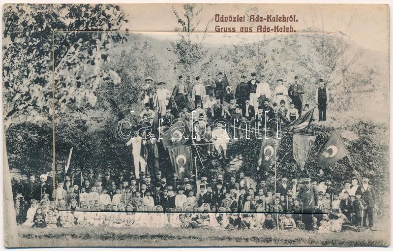 Ada Kaleh, törökök csoportképe török zászlókkal. Leporellolap belül ba... https://www.darabanth.com/en/35-Major-auction/35.1/Postcards/Transylvania~14667/Ada-Kaleh-torokok-csoportkepe-torok-zaszlokkal-Leporellolap-belul-bazarral-es-Bego-Must~II2366404