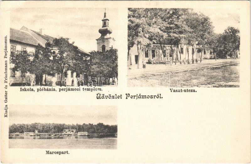 Perjámos, Periam; iskola, plébánia templom, Vasút utca, Maros part. Gatter és Frischmann / school, church, street, Mures riverside (EK)