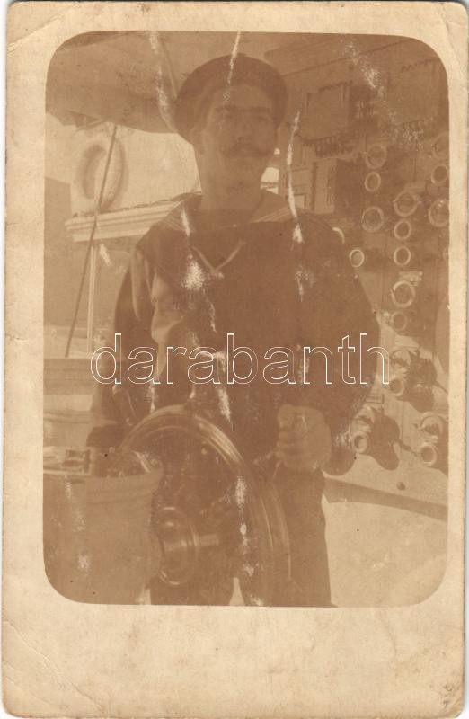 Osztrák-magyar haditengerészet matróza kormányzás közben a fedélzeten / K.u.K. Kriegsmarine Matrose / Austro-Hungarian Navy, mariner with steering wheel on deck. photo (EB)