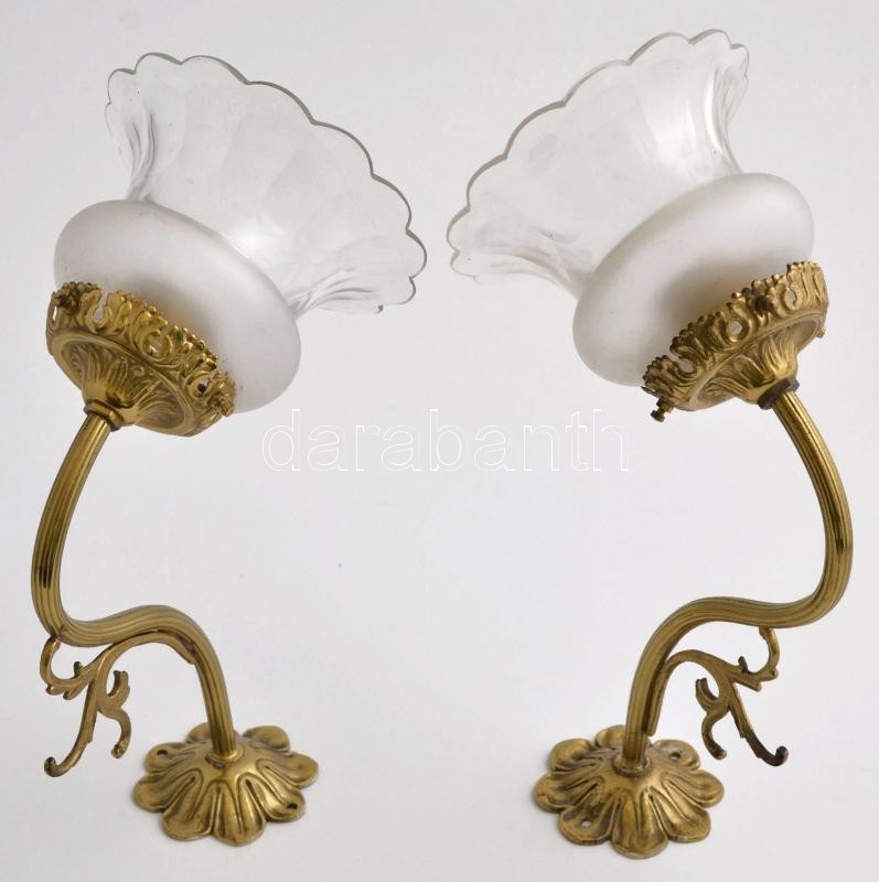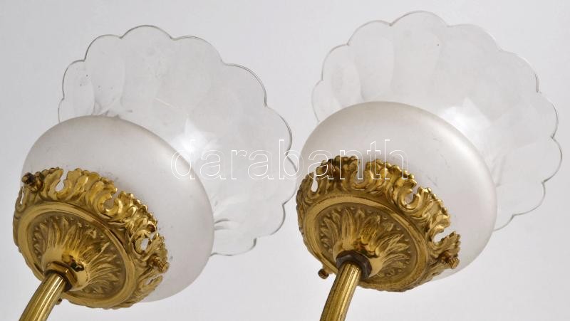 Aranyozott réz falikar párban, maratott csiszolt kristály burákkal, ap...