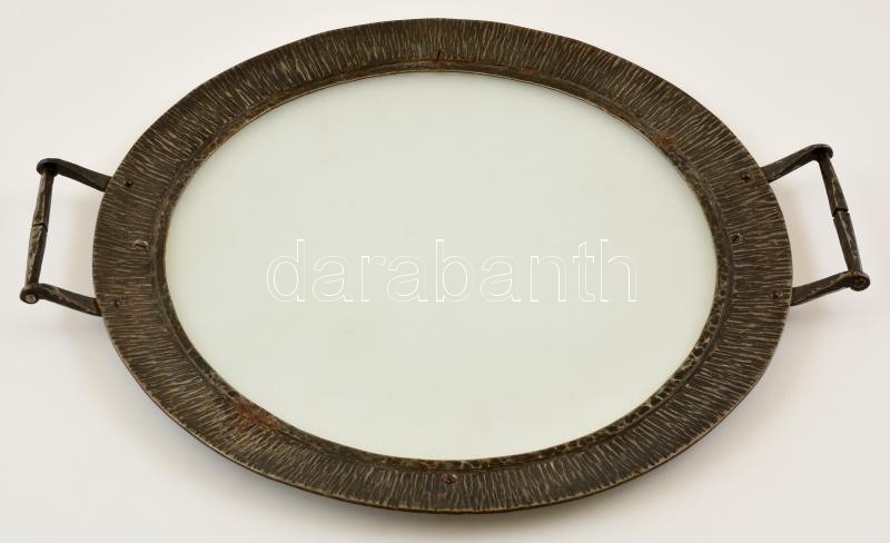 Iparművész fém keretes tál, sérült üveg betéttel, d: 37 cm