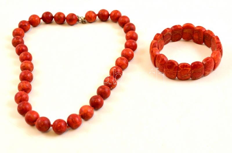 Korall nyaklánc és karkötő, h: 43 cm, d: 6 cm