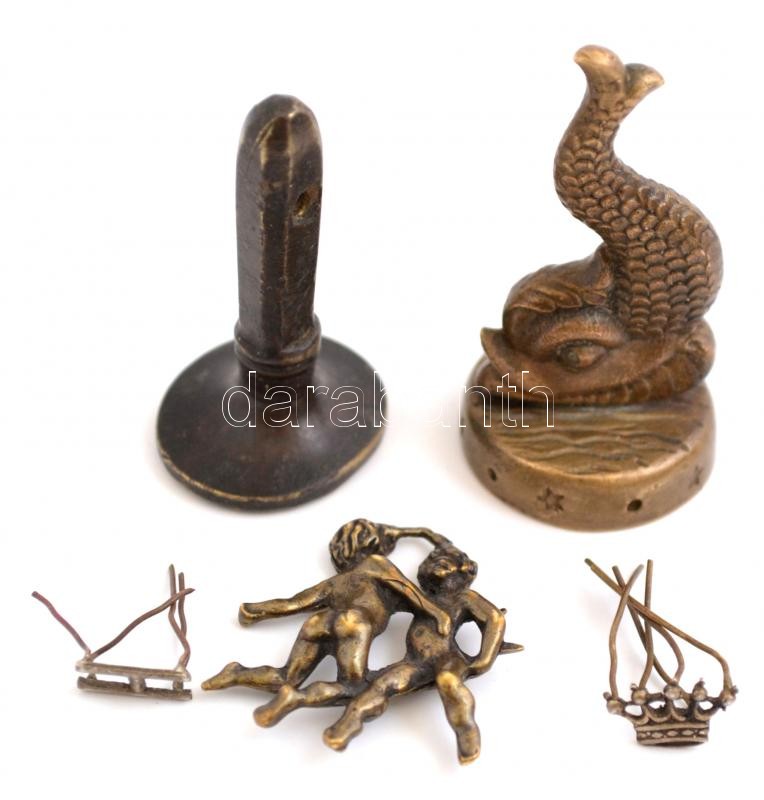 Régi réztágyak: címeres pecsétnyomó, hal-figurás pecsétnyomó, kitűző, ...