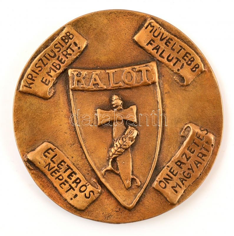 Description: Vegyes KALOT-tétel: réz fejű fokos KALOT-címerrel, h: 74 cm + Domonkos Béla (1934- ): Kerkai Jenő 1904-1970, bronz emlékplakett, jelzett, d: 10 cm + KALOT-felvarró