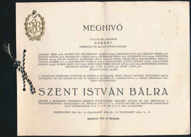 1937 Meghívó a Róbert főherceg fővédnöksége alatt álló Szent István bálra