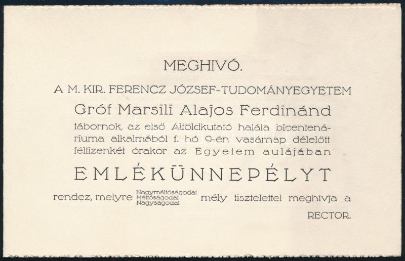 cca 1930 Meghívó a M. Kir. Ferenc József Tudományegyetem által rendezett Gróf Marsili Alajos Ferdinánd emlékünnepélyre