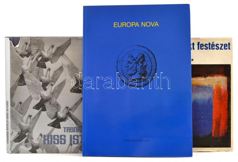 Vegyes művészeti könyvtétel, 3 db: Heinrich Lützeler: Absztrakt festészet. Jelentősége és határai. Bp.,1970, Corvina. Kiadói egészvászon-kötés, kiadói kissé szakadt papír védőborítóban. Tasnádi Attila: Kiss István. Bp.,1982,Képzőművészeti Alap. Kiadói egészvászon-kötés, kiadói papír védőborítóban. Peter Becher-Emil Brix-Aldemar Schiffkorn-Wolfgang Stifter. Europa Nova. Das Neue Bild Europas. A new picture of Europe. 2004, Edition Grenzgänger. Német és angol nyelven. Kiadói papírkötésben. A művész, Zdeněk Antonin Macků (1943-2006) cseh festőművész által dedikált.