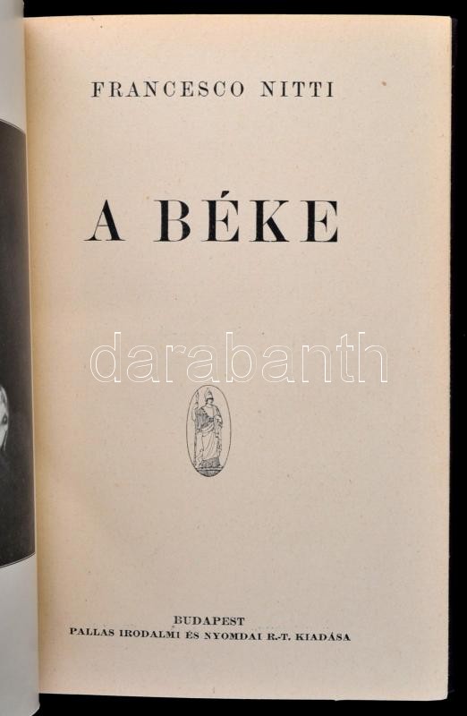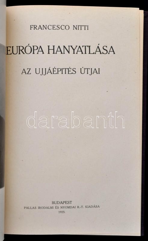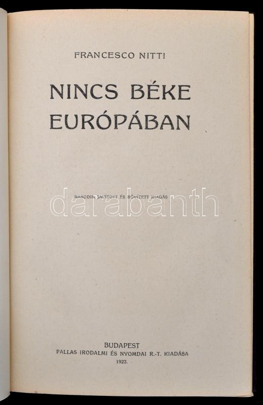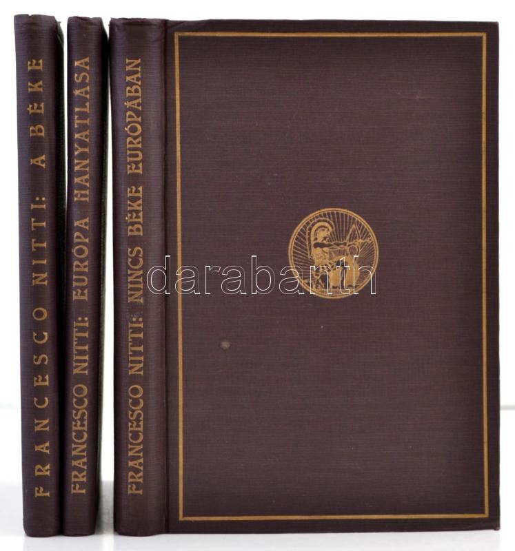 Francesco Nitti három műve: Európa hanyatlása. Az újjáépítés útjai. Bp.,1923, Pallas Irodalmi és Nyomdai kötés, 1 t.+227 p. Első kiadás. Nincs béke Európában. Bp.,1923, Pallas Irodalmi és Nyomdai kötés, 1 t.+215 p. Második, javított és bővített kiadás. A béke. Bp.,[1925], Pallas Irodalmi és Nyomdai kötés, 1 t.+162+2 p. Első kiadás. Kiadói aranyozott egészvászon-kötésben, szép állapotban.
