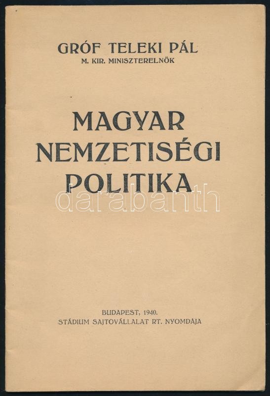 https://www.darabanth.com/en/350-Online-auction/350.0/Books/Books-History~52/Grof-Teleki-Pal-Magyar-nemzetisegi-politika-Bp-1940-Stadium-Kiadoi-papirkotes-jo-al~II1991033
