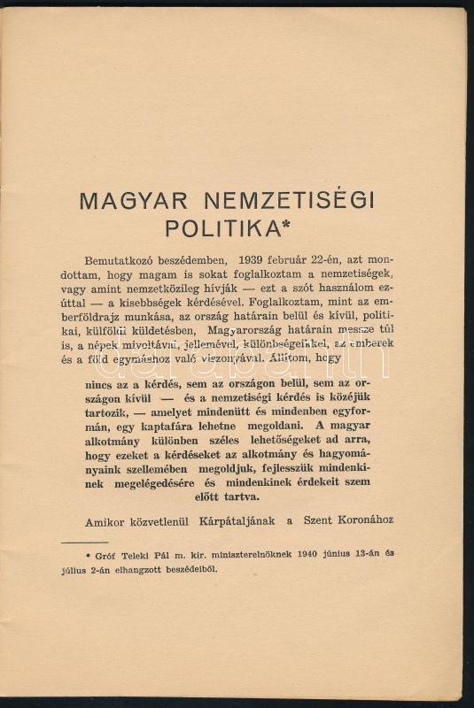 Gróf Teleki Pál: Magyar nemzetiségi politika. Bp., 1940, Stádium. Kiad...