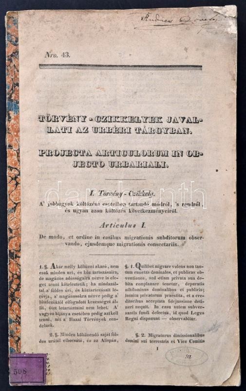 Description: cca 1830-1840 Törvény czikkelyek javallatai az urbéri tárgyban. Projecta articulorum in objecto urbariali. Nr. 43. hn., é.n, nyn., 1-10+I-XXIV+11+68 p. Papírkötésben., az első és az utolsó lapon kis szakadással, sérüléssel, tulajdonosi névbélyegzővel és névbejegyzéssel.