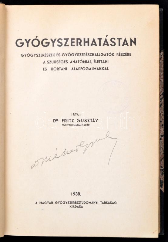 Dr. Fritz Gusztáv: Gyógyszerhatástan. Gyógyszerészek, és gyógyszerhallgatók részére, a szükséges anatómiai, élettani és kórtani alapfogalmakkal. Bp.,1938, Magyar Gyógyszerésztudományi Társaság, 407 p. Átkötött félvászon-kötés, márványozott lapélekkel, jó állapotban.