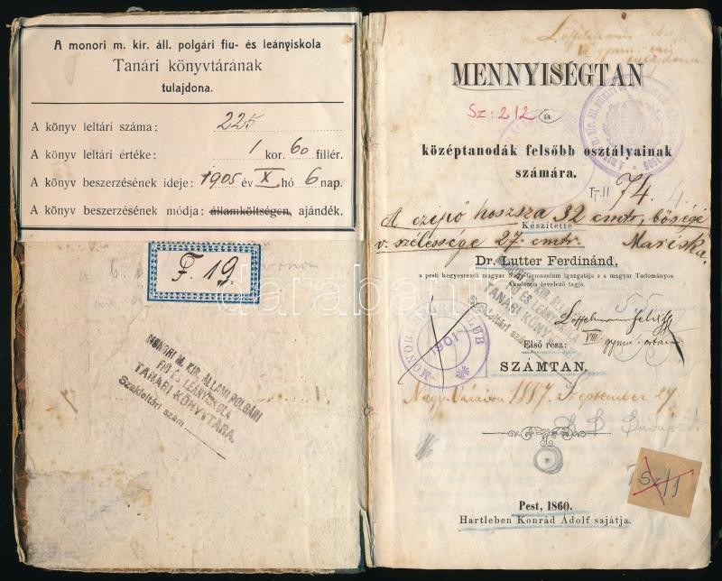 Dr. Lutter Ferenc: Mennyiségtan a középtanodák felsőbb osztályainak számára. Pest, 1860, Hartleben Konrád Adolf. Félvászon kötés, könyvtári bejegyzésekkel, pecsétekkel, foltos.